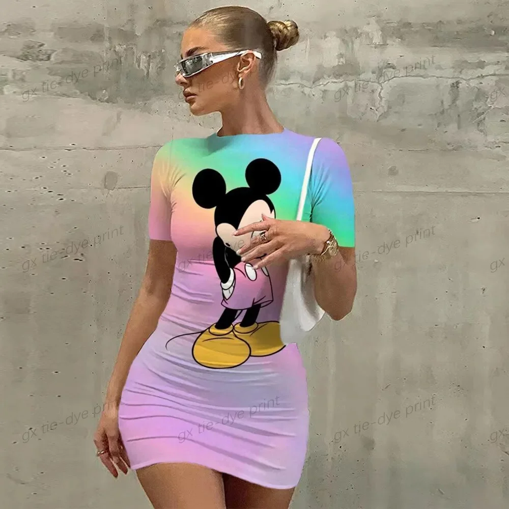 Introducing our brand-new Women’s Wear Short Sleeve Outdoor Sports Sexy Tight Mini Short Dress, perfect for the upcoming summer season. This dress features a delightful Disney Minnie and Mickey Mouse cartoon print, adding a touch of fun and nostalgia to your wardrobe.